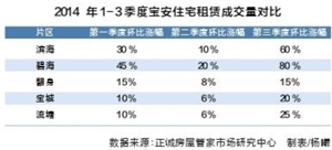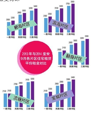 从成交量上看,2014年9月,宝安住宅租赁成交量环比涨幅为17.55%。各片区都呈现增长趋势,幅度从10%至80.5%不等,其中成交量涨幅最大的是碧海片区,环比增加80.5%,其次是滨海片区环比增加35.66%、宝城片区环比增加20%。中联地产金成时代分行经理吴豪告诉记者,从各片区租赁市场活跃度来看,碧海与滨海片区仍然是租赁市场最活跃的区域,承担了全区三分之二的租赁量。