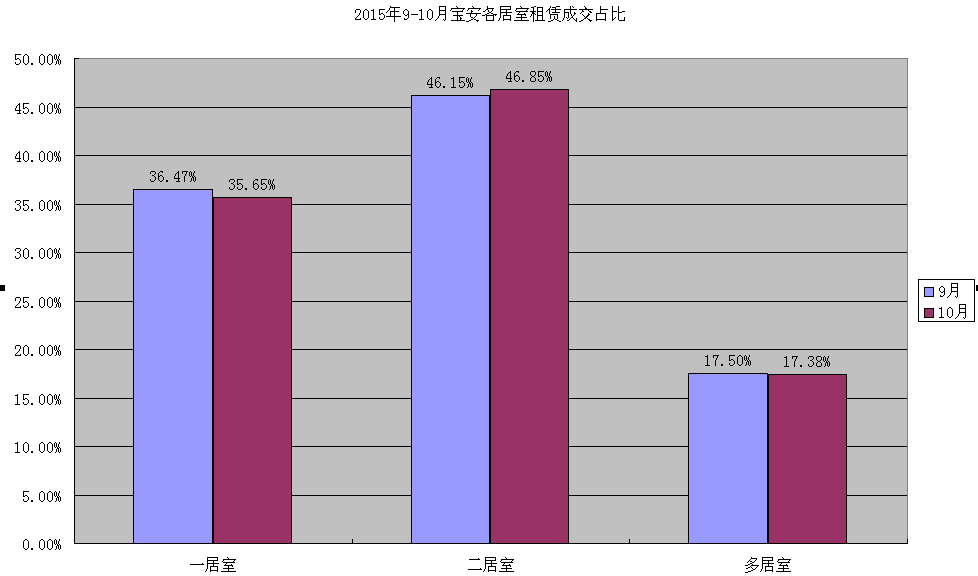 从出租房源的户型来看,本月成交主力居室为一室和两室。其中一居室成交占比35.65%,较9月36.47%相比,环比下降0.82%;二居室成交占比46.85%,较9月46.15%相比,环比上涨0.9%;多居室成交占比17.5%,较9月17.38%相比,环比上涨1.32%。
