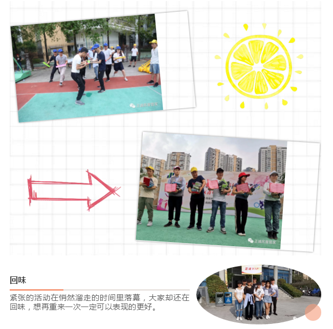活动紧张的进行着,好几个活动,最有趣莫过于旱地龙舟,同心击鼓和珠行万里。旱地龙舟的活动里,我们都很认真观察先其他队伍在比赛当中表现,吸取他们的经验教训,轮到我们上场,扛起龙舟齐步走的时候,大家步调一致,速度远远超越跟我们同时走的其他队伍,轻松领先;同心击鼓的时候,球都经常调皮的往下掉,但是我们队员都全神贯注,只要球一掉,立马就被队员迅速拾起,炽热的阳光下,队员们的后背都湿透了;珠行万里更考验团队的紧密合作,我们的队员们都密切合作,迅速排成两排,滑行的球在光滑的管道上面急速滑过时,我们都默契的接上,成功的把它送到终点。这时大家的脸上都才露出轻松满足的微笑。