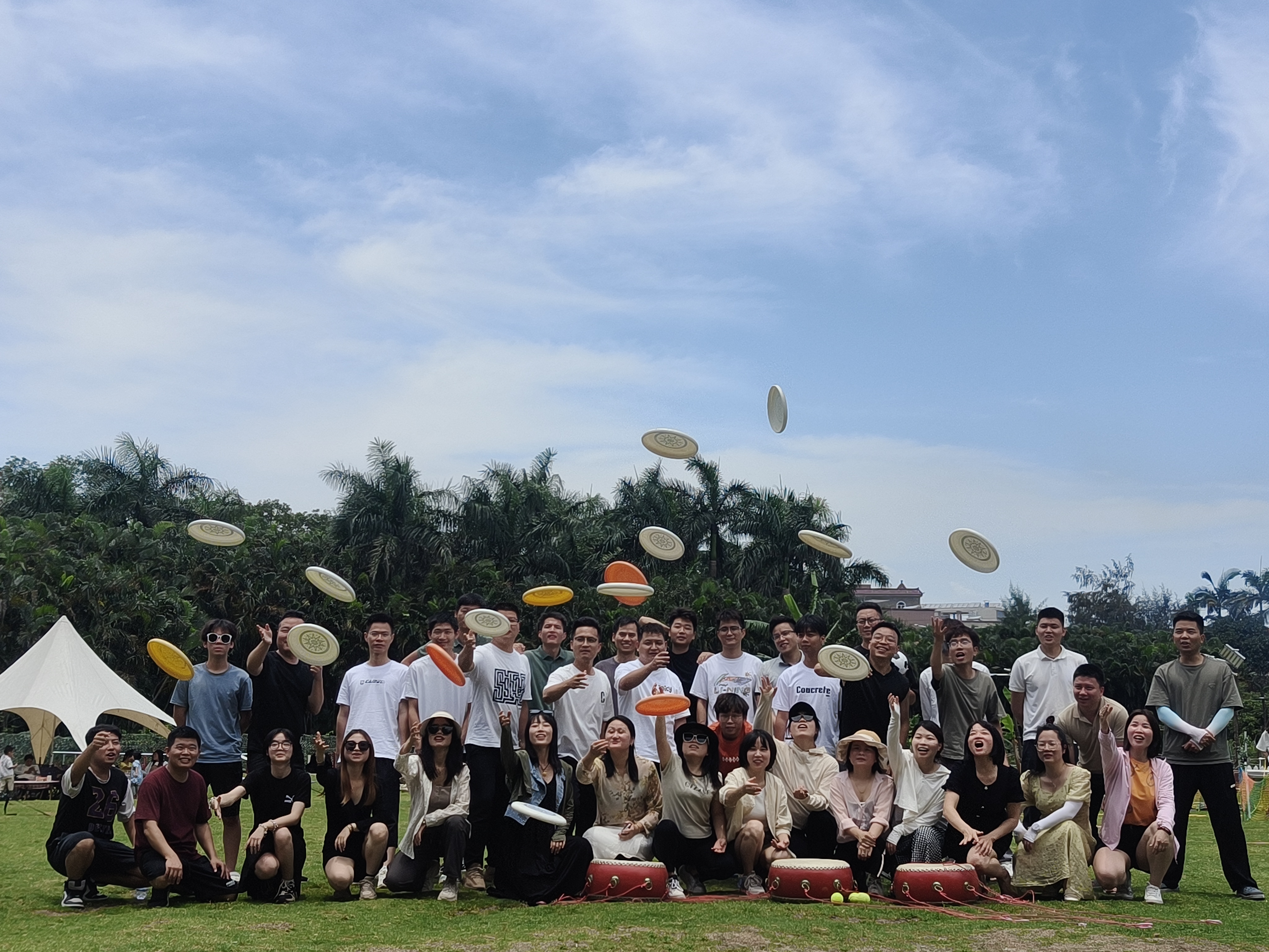 专业教练的热身游戏,飞盘、同心鼓的基础教学,分队互相竞技,一瞬间点燃了大家的激情。三支队伍(销冠队、颜值队、牛牛队)互相喊口号展示各队的风采,每一次抛盘和接盘、保持同心鼓的平衡,都在考验着队友之间的协作配合,虽然大汗淋漓,但每个人都在尽情享受着运动后的快乐,同时也体会到了“众人一心,其利断金”的团结之意。