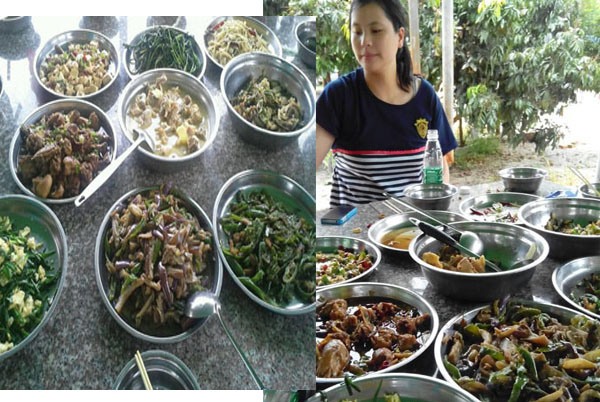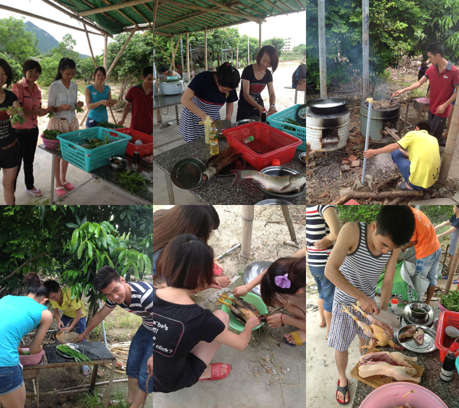 中午(12:40)同事们经过一个多小时的艰苦“奋斗”,果然“功夫不负有心人”啊!我们完美地呈上了一个一个香喷喷的菜肴,有香煎鱼、韭菜炒蛋、小炒茄子、啤酒鸭、小炒肉、香煎豆腐、酸辣土豆丝、农家鸡煲等,我们终于开吃了,看着大家夹菜争先恐后,狼吞虎咽的样子,感觉一下子大家好像回到了童年。