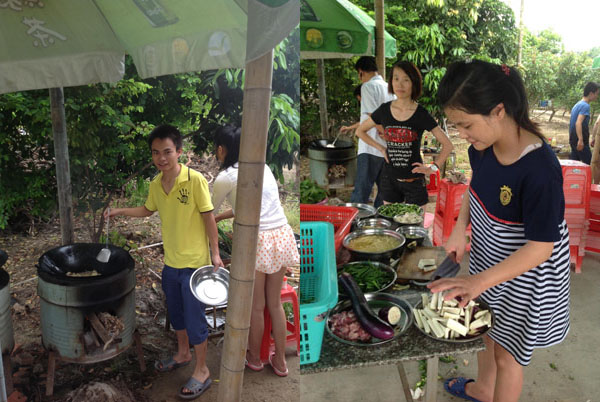 (10:40)农庄老板派发了我们今天野炊的食材,分别有:鸡、鸭、鱼、肉、茄子、青菜、鸡蛋、韭菜等;大伙纷纷从老板那里领到了食材,分工合作,有的洗菜,有的切菜,有的杀鸡,有的杀鱼,有的杀鸭,看这两位帅哥负责烧火,旁边这两位美女就负责拔鸡毛,各有各的安排,各有各的任务,忙的不亦乐乎。