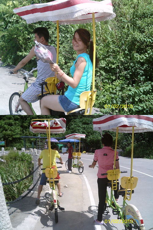 下午(14:30)我们到了杨梅杭--骑车环海游玩,大家都选上自已友好的拍档,骑上两人自行车,沿途美景,伴随丽日下的海风,在电视上常看到只有王子与公主的浪漫之骑的画面,终于浮现在自己的眼前,看着蓝蓝的海水,温柔的卷起层层浪花,同事们都其乐融融。